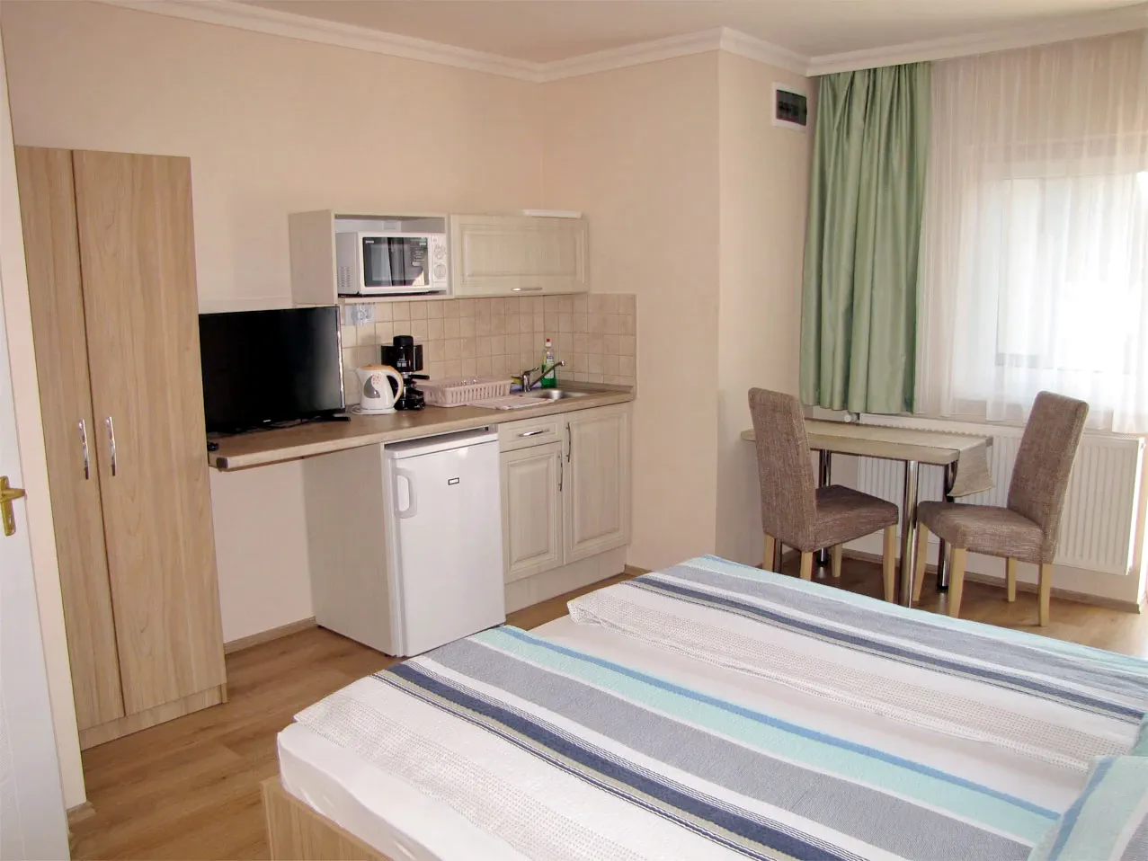 bucătărie dotată: mașină de cafea, prăjitor de pâine, cuptor cu microunde, frigider